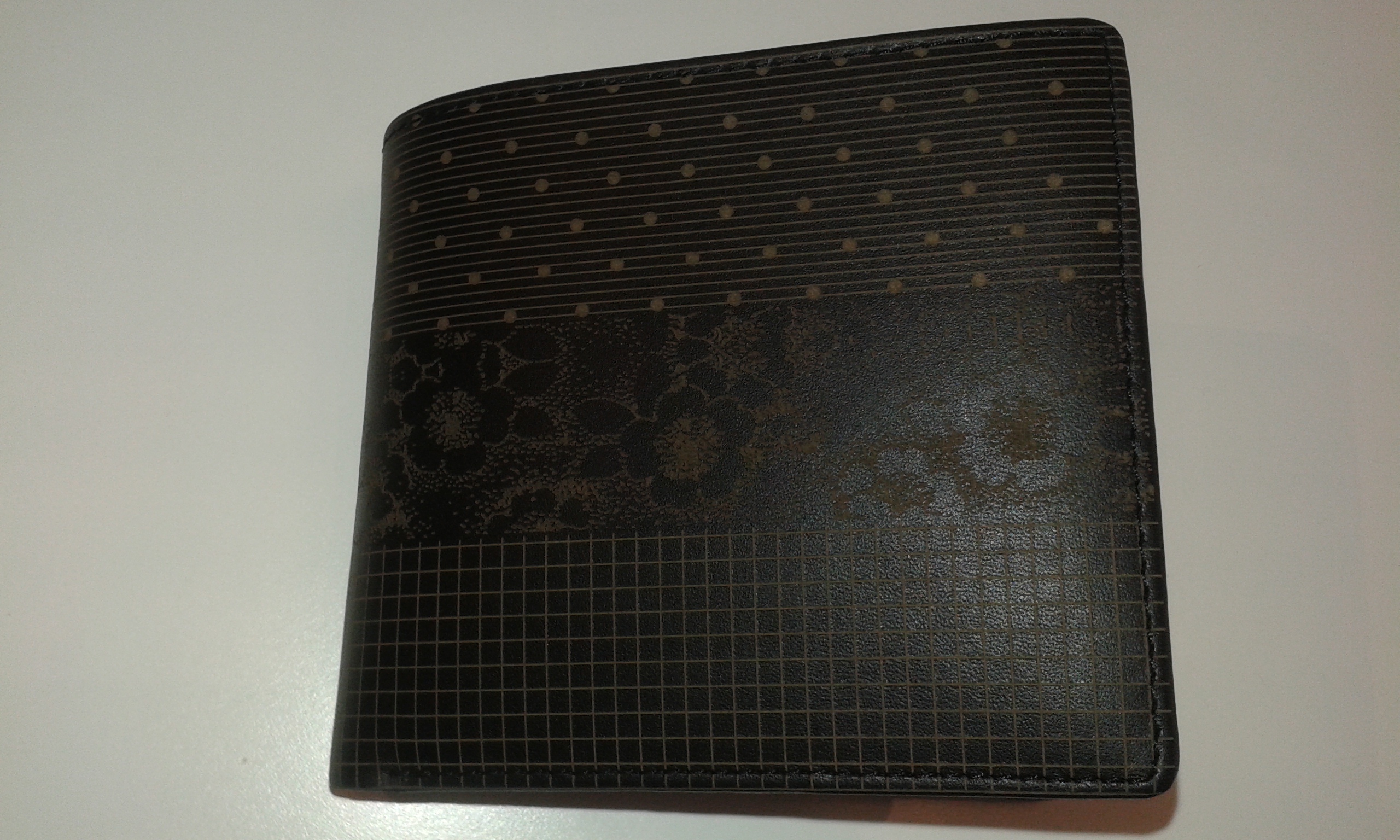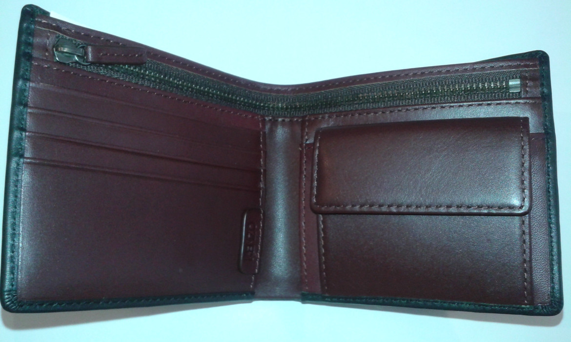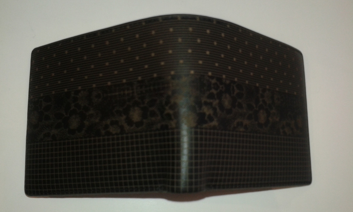 Portefeuille en cuir marron avec fantaisies ( fleurs, petits pois et carreaux). Interieur lie de vin